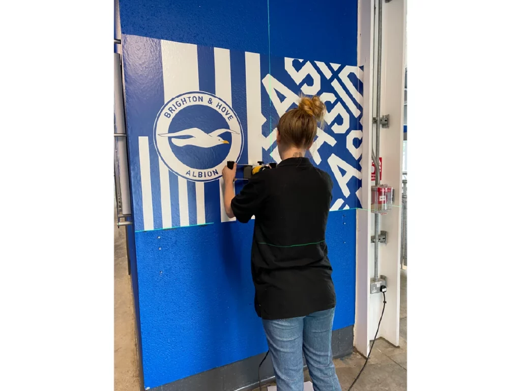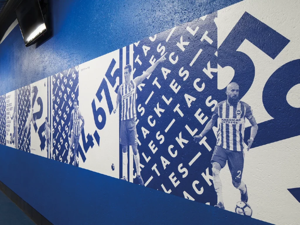 We used specialised wall conformable vinyl graphics, applied to painted breeze blocks. This was post-heated and rolled to adhere to the contours and imperfections in the wall surface – creating an effect that makes the graphics look as though they are painted directly onto the walls. We received an overwhelmingly positive reaction from the club and fans alike. This was achieved on time, and to budget.