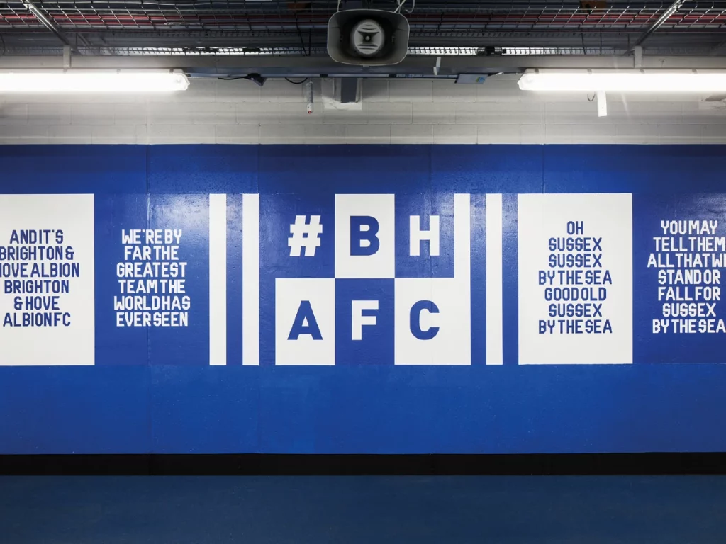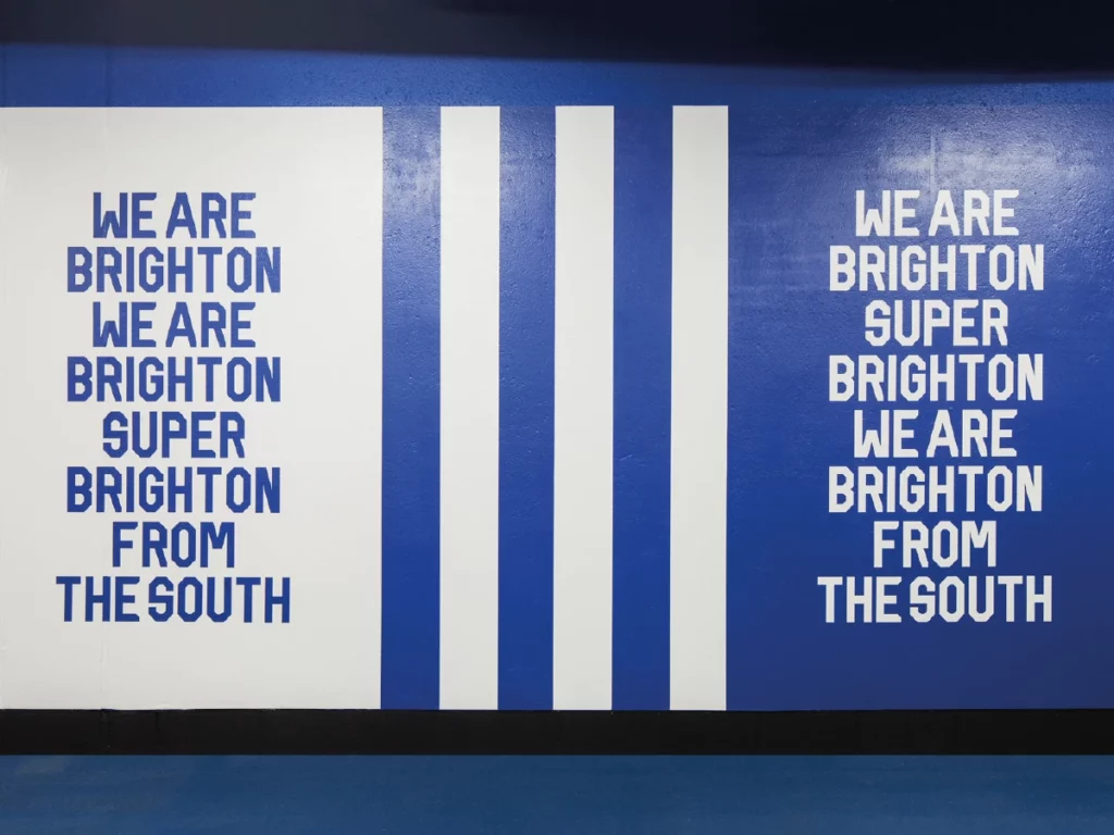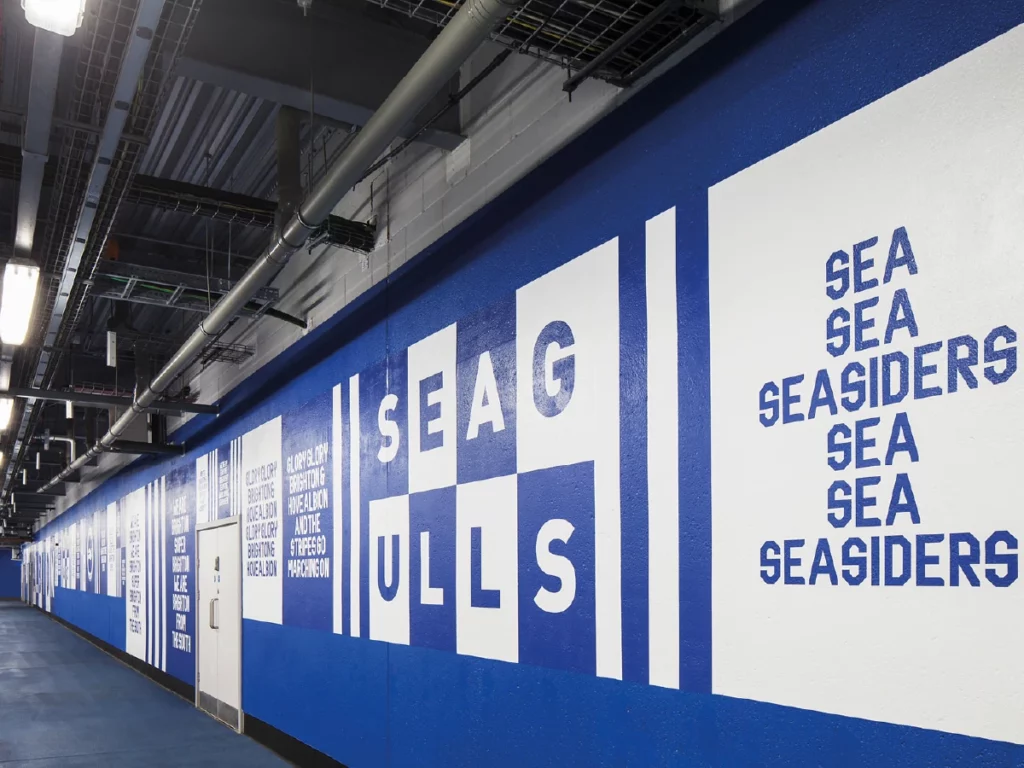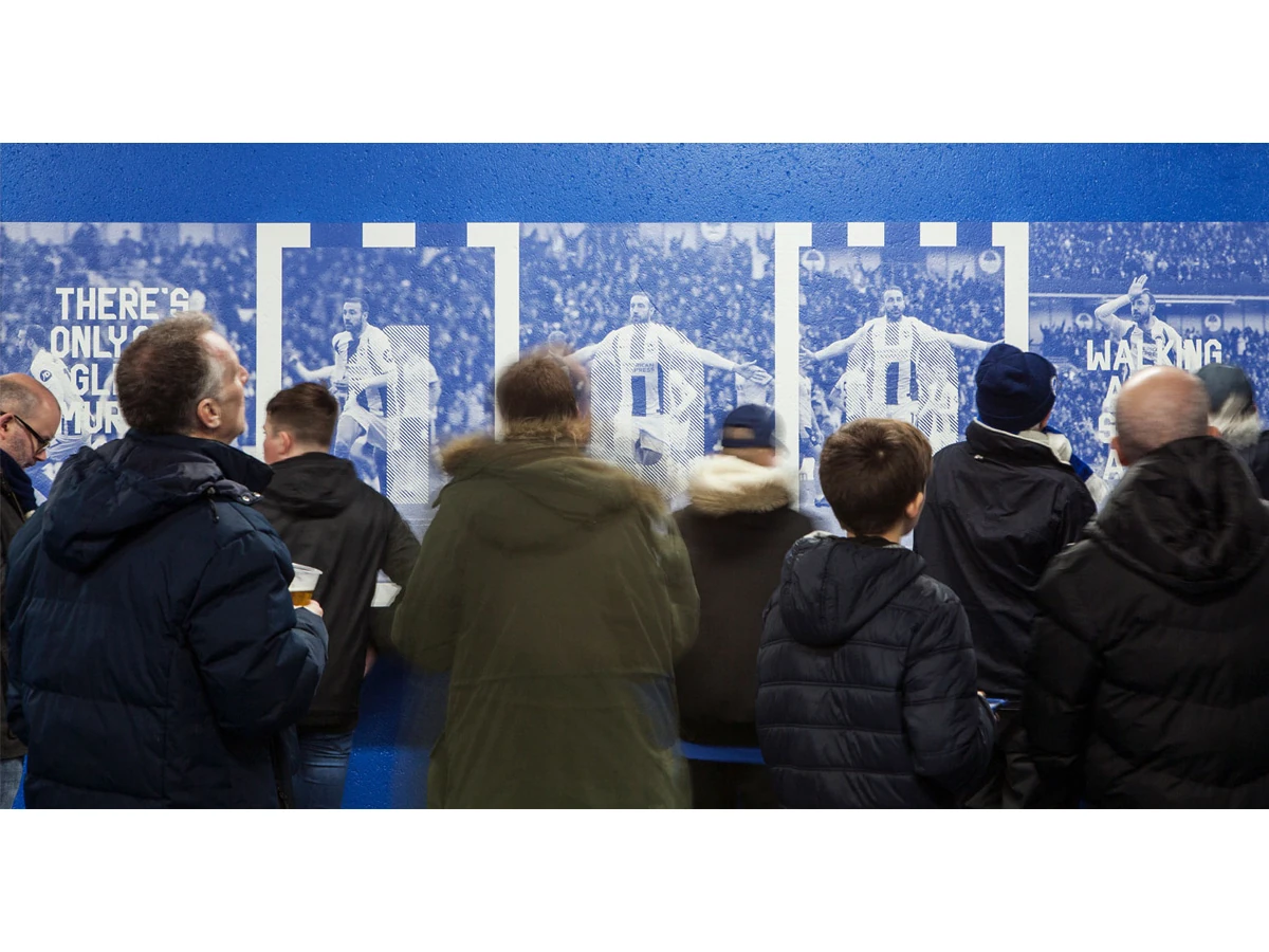 Transform the interior of the Falmer stadium’s Lower East and Upper West stand concourses. All elements needed to incorporate the club’s new visual identity, while celebrating the heritage of the Seagulls, to create an impactful and emotionally rousing experience for fans and visitors.